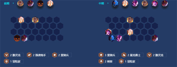 前期有黯灵龙的弈子直接留,可以赛娜+厄斐琉斯组成两炮手作为后排,芮尔+瑟庄妮组成两重骑兵作为前排,过渡的原则就是有后排有输出,两个格斗家、两个重骑兵、两个护卫都可以作为前排,两射手、两炮手、两神龙尊者,三法师都可以作为我们的后排。