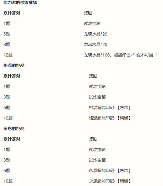 超能印记:此印记将长期展示在“能力者的试炼挑战”系列答题活动的超能档案中,随活动返场,特定节点用于兑换游戏内道具。