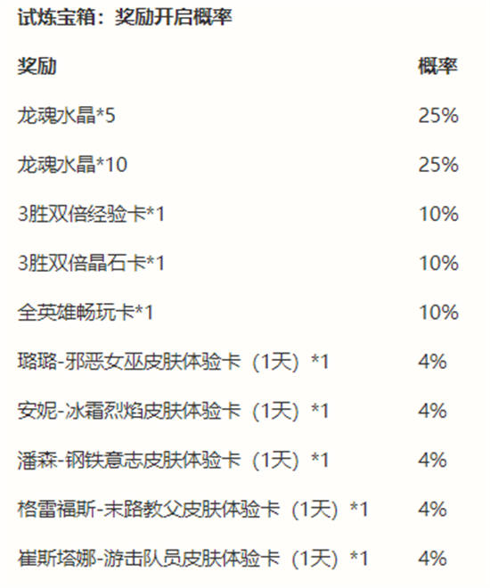 试炼宝箱:开启随机获得龙魂水晶、经验加成卡、蓝色晶石加成卡、全英雄畅玩卡、指定皮肤体验卡(1天)