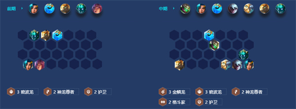 前期不拉人口,前期拿3碧波开摆过渡。3-2跳6人口。选秀阶段优先去拿卡莎的蓝霸服 如果没有卡莎选择用塔莉娅,有卡莎搭配任意一神龙英雄补充神龙英雄即可。