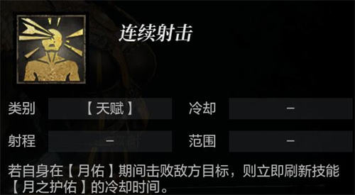 唤月者的天赋,主要辅助主动技能月之护佑。在唤月者开启月之护佑技能、获得月佑效果期间,击败敌方目标后,可以立刻刷新月之护佑的冷却时间。