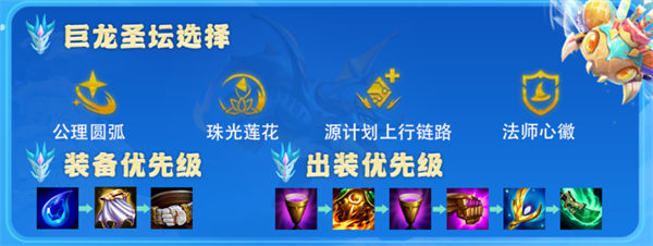 这套阵容只有在诺姆希是法师羁绊的时候考虑,阵容7级开始进入强势期,锁血能力极强,吃分与吃鸡均比较稳定。开局第一次选秀拿取水滴最优,其次魔抗与腰带,可合成圣杯或日炎。第一个符文有公里圆弧、珠光莲花、源计划上行链路、在一起更好最优。