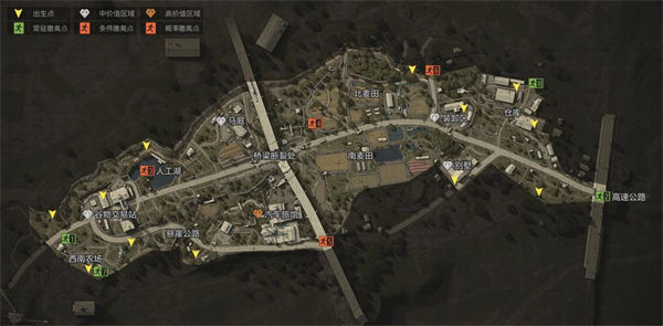 农场:农场地形狭长,出生点主要分布在东西方向约1/3的区域。