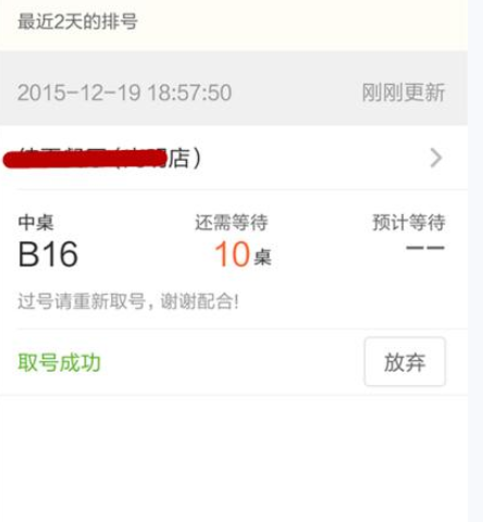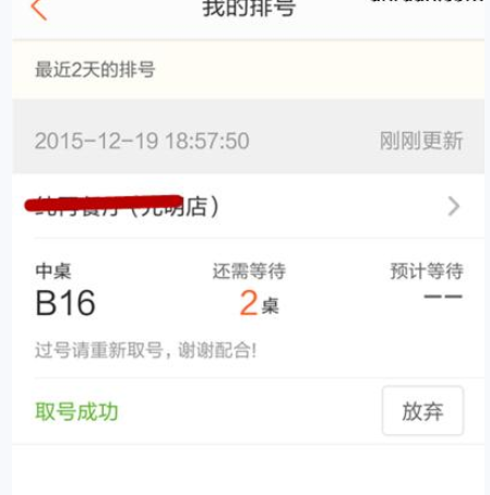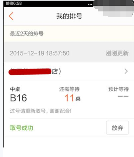 2、到了准备吃饭的时候,再打开大众点评客户端,去查看订单当前的排号情况,如下图。