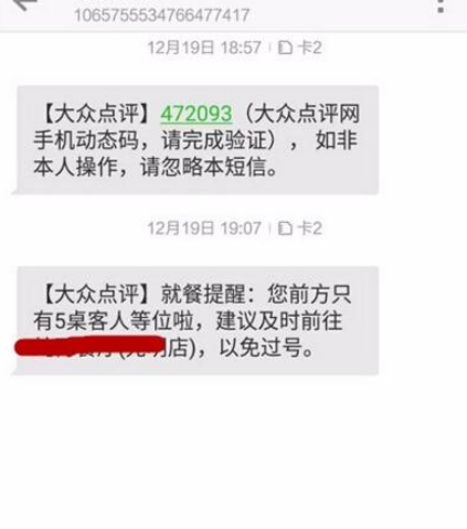 5、当大众点评当前客人只有5桌或更少的时候,大众点评就会给你发短信提醒你,让你尽快赶到就餐地点,以免过号。