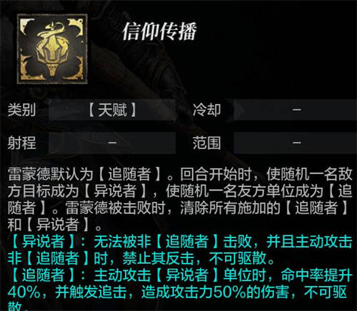 雷蒙德的机制比较特殊,除普攻之外,包括列席光环在内的主动、被动技能,均围绕天赋为我方和敌方附加的【追随者】和【异说者】状态为主。我们先来详解下雷蒙德的天赋。