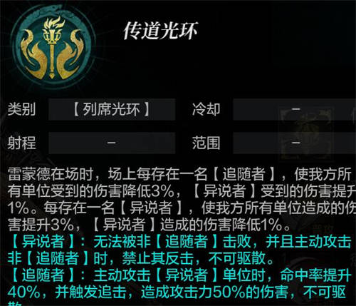 雷蒙德的列席光环,能够依据敌我双方【追随者】和【异说者】数量,对我方在伤害和承伤方面进行补强: