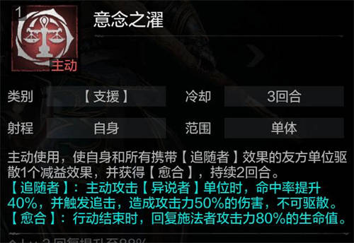 第3回合开始后,我方四名友军全员均可具备【追随者】增益效果。具备【追随者】状态的友军,在主动攻击有【异说者】状态的敌军时,自身命中率提升40%、并触发50%攻击力伤害的追击。