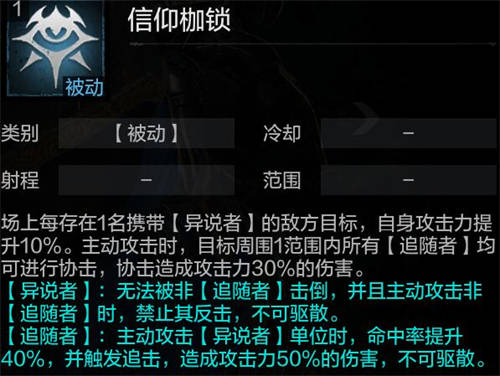 场上每存在一名【异说者】,我方所有单位伤害提升3%(存在4名追随者最高提升12%),【异说者】造成伤害降低1%。