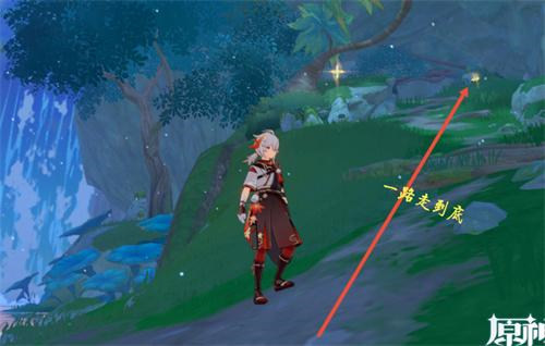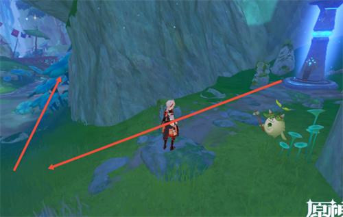 2、在达到一个瀑布旁边的位置时,根据红色箭头一直走到底。