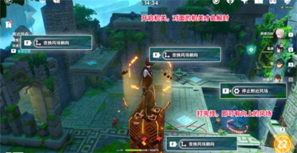 3.打完怪,出现风遁币,机关解封,出现向上的风场,飞上去,先停止附近风场,再把2个机关变换风场朝向各1次,飞到上面开启方块机关,对面的机关解封,再变换风场朝向,即可往上飞到平台。