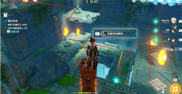 1.进入挑战,第一个机关不停风场也没事,可以直接拿,在箭头机关处,变换风场朝向,即可往上飞,拿到风遁币,并飞到对面平台。