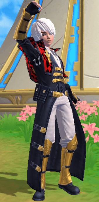 4.男骑士同色系的护甲保护着四肢,只不过他的“披风”换成了更帅气的长款皮质斗篷风衣,风衣上也有金属的元素,上身的效果简直酷爆了,腰间也有四个装东西的皮质小包。