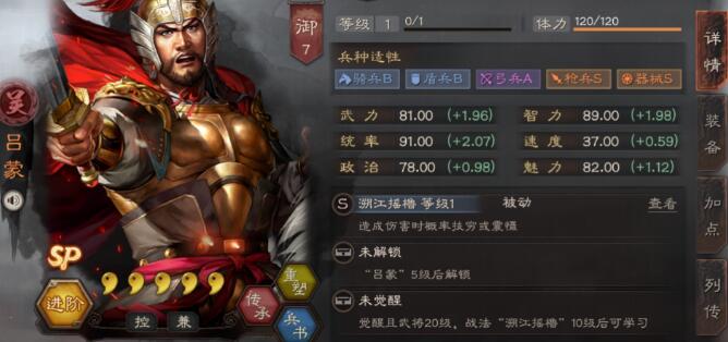SP吕蒙的面板非常不错,除了速度外,都是80-90的初始值,以及2.0左右的成长,非常均衡,不论是做主将、辅助、输出,都是可以的。适性方面继承了普通吕蒙的适性,单就适性而言,SP吕蒙依旧是吴弓、吴枪的不二辅助。