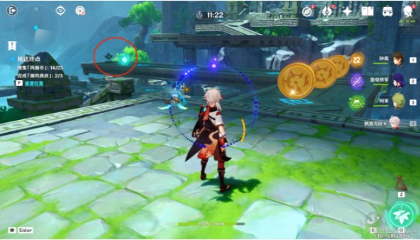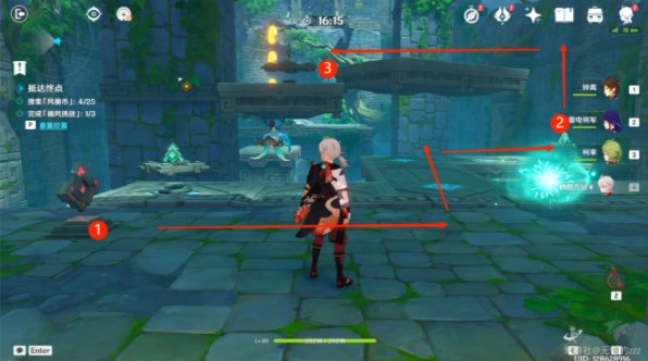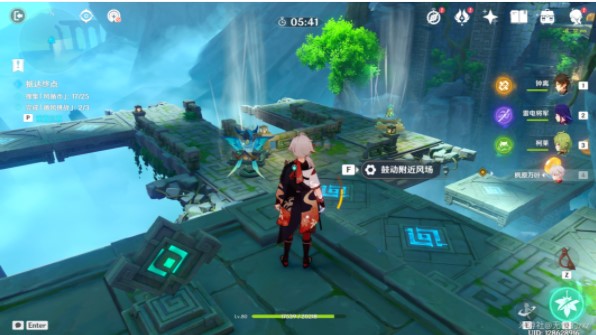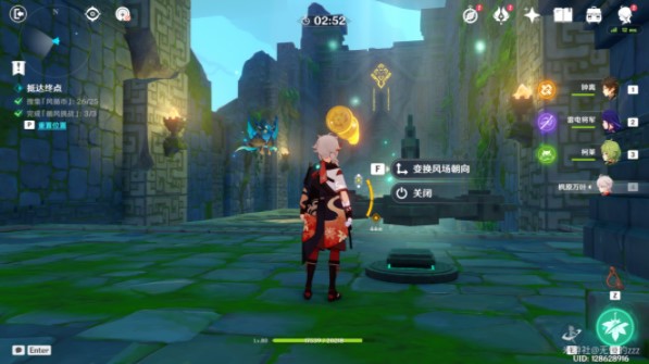 1.首先,我们进入秘境以后,先关闭图中右侧的机关,将风场关闭,随后将左边的拦风枢的风场方向调整为向上,随后往左走
