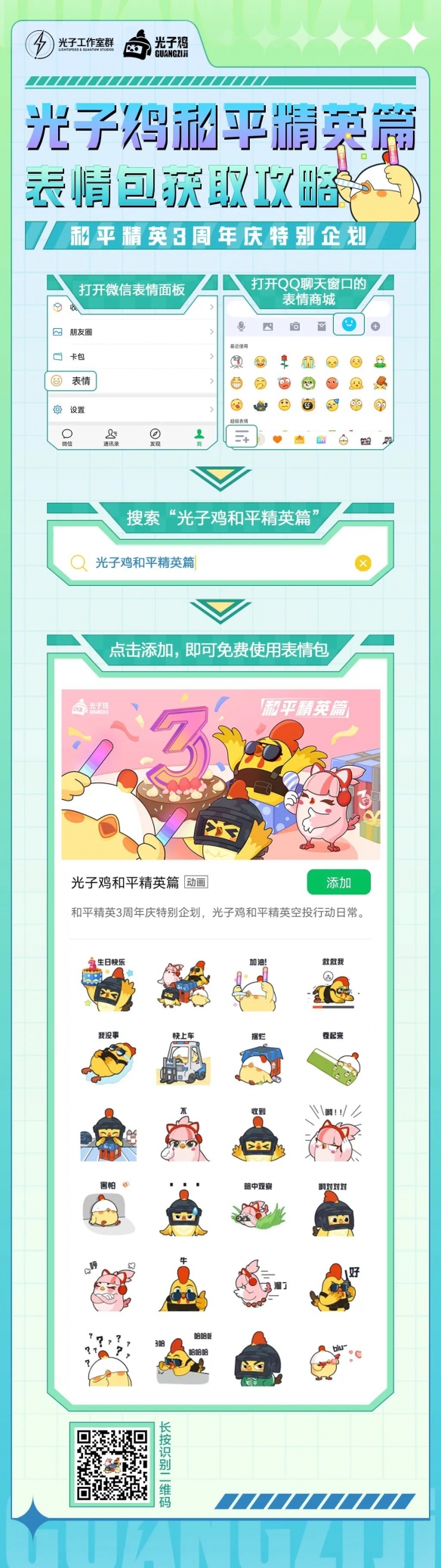 这次和平精英3周年庆特别企划表情包,希望能带给你欢乐,并在游戏外陪伴着你,感受来自光子鸡们的爱~