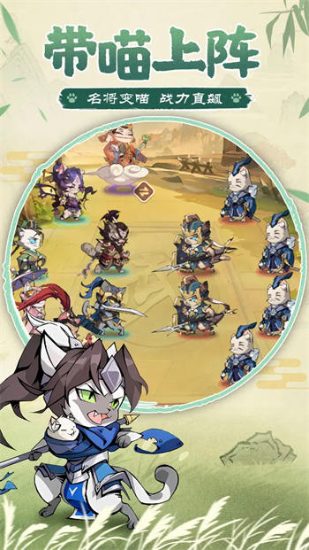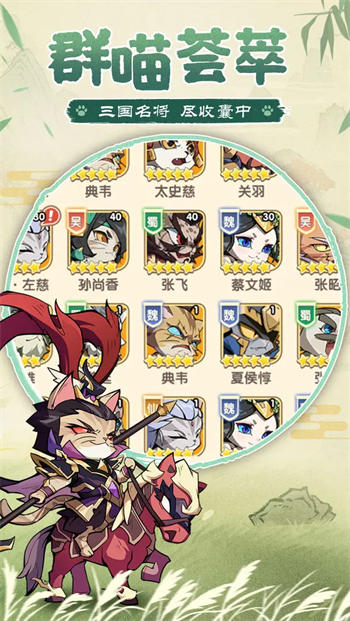 1、三国英雄与可爱猫咪元素融合,打造别具一格萌猫武将形象,每位武将独特萌态。
