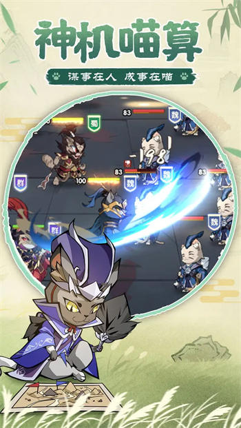 2、回合制卡牌战斗模式,策划搭配猫咪武将属性技能,制定智胜战术。