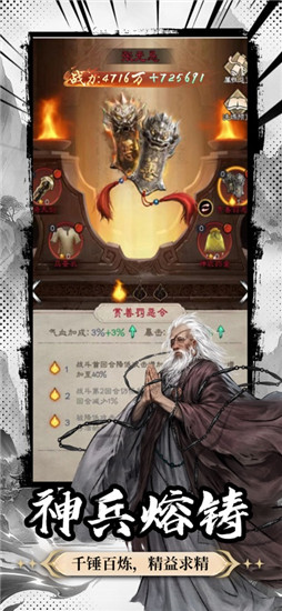 通过随机副本可获得倚天剑屠龙刀等各种神兵利器的碎片,合成完整神兵选择上阵后提供上阵侠客属性加成,并可在战斗中释放超强技能,全面提升阵容战斗能力。