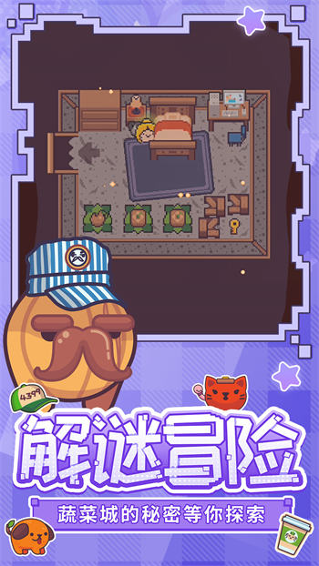 大头菜菜历险记官方版是一款融合像素冒险、解谜探索与经营元素的治愈系冒险手游,在游戏中,玩家将扮演一颗因未及时缴税而被驱逐家园的拟人化大头菜,开启一场充满黑色幽默的还债冒险。大头菜菜历险记官方版以洋葱市长颁布的"史诗级债务清偿计划"为主线,通过地下城闯关、社区任务、种植经营等多元化玩法,逐步揭露破坏蔬菜王国安定的阴谋。在横跨森林、沙漠、雪山、海底的奇幻旅程中,玩家需运用智慧解开200+风格迥异的机关谜题,收集税务文件、稀世珍宝与可互动道具,同时招募南瓜武士、蓝莓护士等特色伙伴组建三人小队,对抗威胁花园社区的巨型野兽。